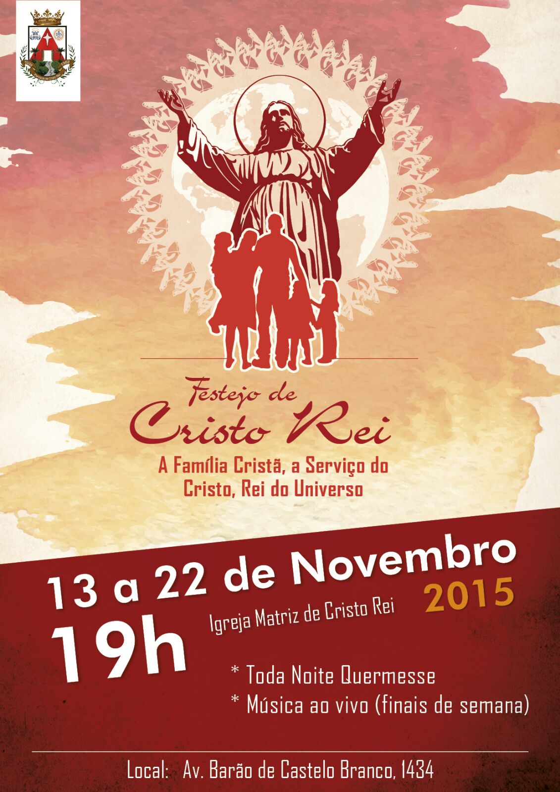 A partir do dia 13 de novembro a Paróquia de Cristo Rei estará em festa. É que no período de 13 a 22 de novembro terá início a programação dos festejos da comunidade. Com novenas, quermesses e apresentações musicais a programação será realizada na sede da Paróquia localizada no bairro Cristo Rei, na zona sul de Teresina.