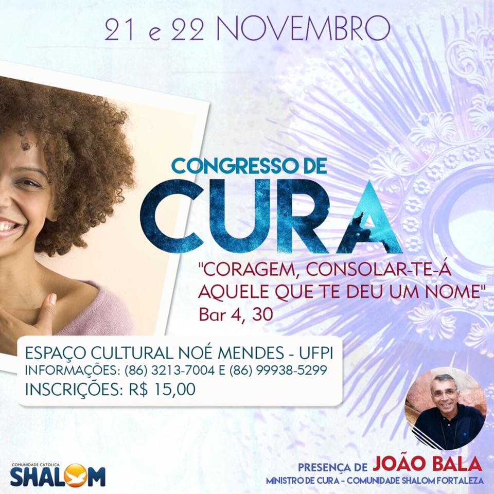 Dias 21 e 22 de novembro a comunidade Shalom promove o primeiro Congresso de Cura com o tema “Coragem, consolar-te-á aquele que te deu um nome”. O congresso contará com a presença de João Bala que é ministro de cura da Comunidade Shalom Fortaleza.