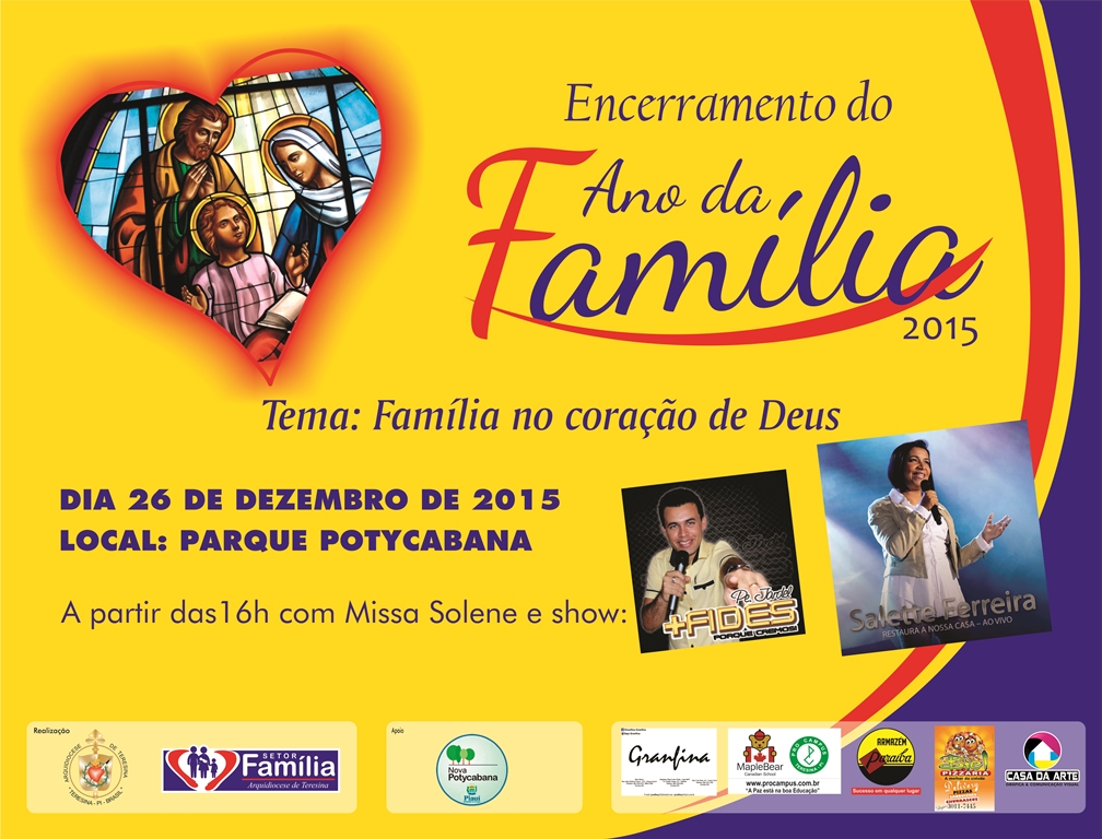 O Setor família da Arquidiocese de Teresina realiza no dia 26 de dezembro, a partir das 16h, no Parque Nova Potycabana, a missa de encerramento do Ano da Família que será presidida pelo Arcebispo de Teresina, Dom Jacinto Brito. Com o tema “Família no coração de Deus” a programação da grande noite de oração terá início com a participação do Padre Jardel Moreira e Banda + Fides, seguida da Santa Missa e encerramento com o show da cantora da Comunidade Canção Nova de São Paulo, Salete Ferreira.