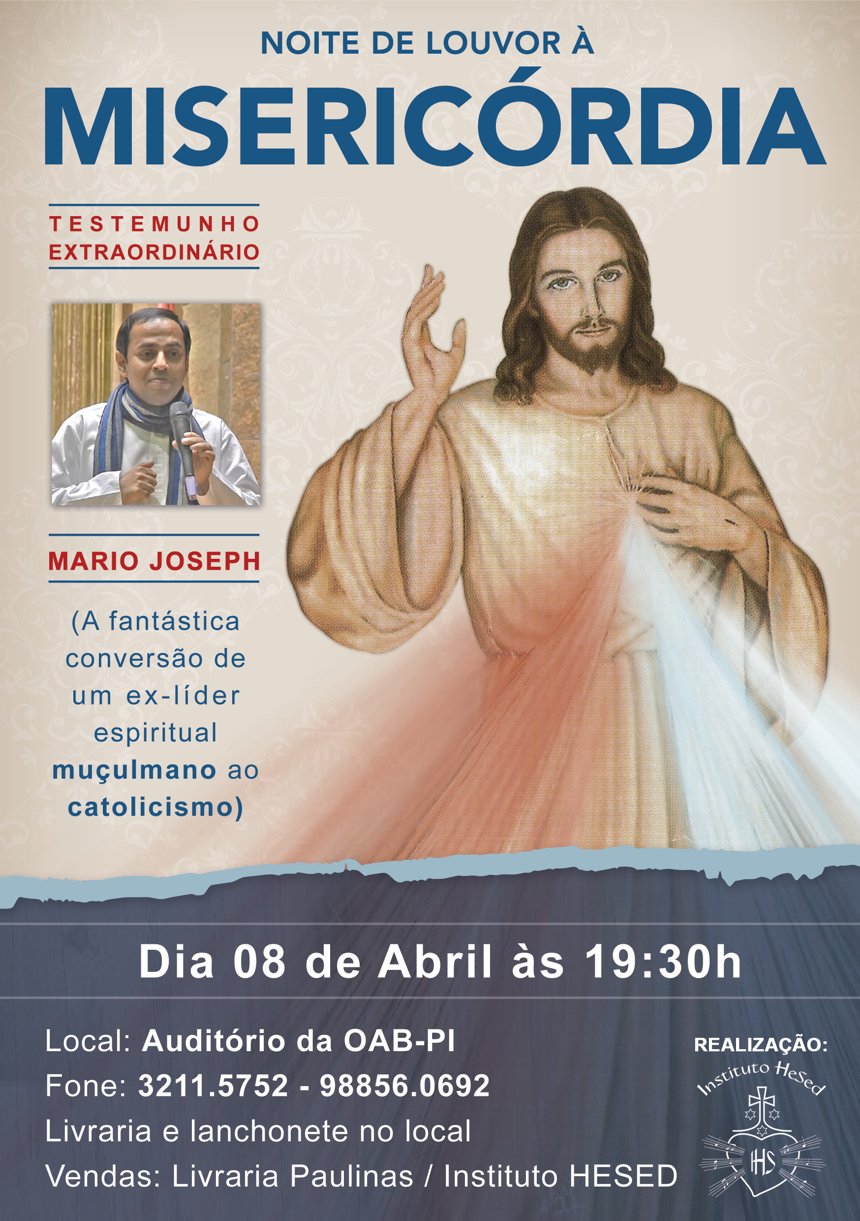 O Instituto Hesed realiza no próximo dia 8 de abril, a partir das 19:30h uma ‘Noite de Louvor à Misericórdia’. O instituto é um espaço de evangelização e abriga irmãs com vida religiosa dedicada ao Pai e tem como público alvo os católicos e demais filhos de Deus que tenham interesse em experimentar momentos de fortalecimento da fé baseados no legado e na história do Filho de Deus.