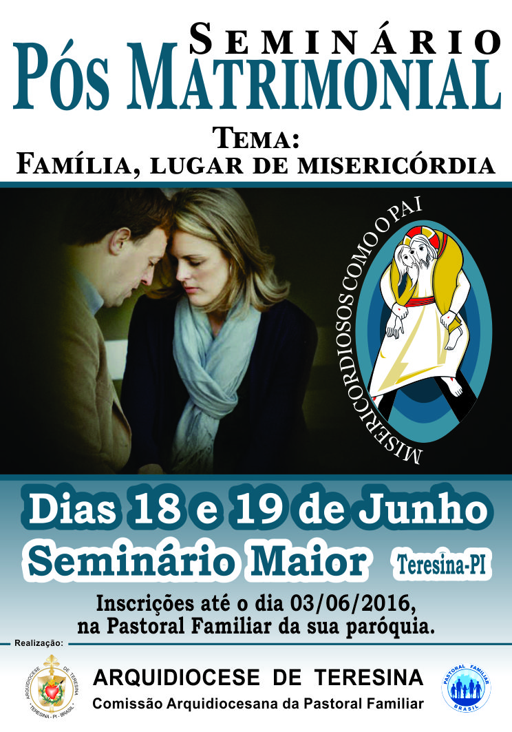 “Nenhuma família é uma realidade perfeita, mas requer um progressivo amadurecimento da sua capacidade de amar”. Esta é uma afirmação do Papa Francisco na exortação apostólica “Amoris Laetitia – A alegria do amor”. Com este cuidado, a Comissão Arquidiocesana da Pastoral Familiar promove nos dias 18 e 19 de junho o Seminário “Pós Matrimonial”. O evento será realizado no Seminário Maior Sagrado Coração de Jesus.