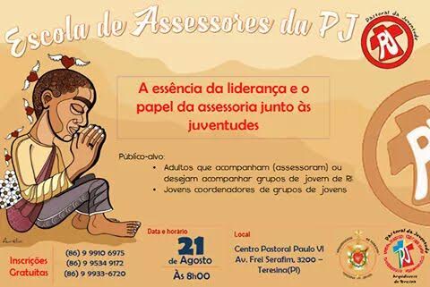 A pastoral da Juventude da Arquidiocese de Teresina está com as inscrições abertas para a escola de Assessores da PJ. Com foco na qualificação dos seus colaboradores, a pastoral convoca interessados para participarem de uma formação a ser realizada no dia 21 de agosto, a partir das 8h da manhã, na sede do Centro Pastoral Paulo VI.
