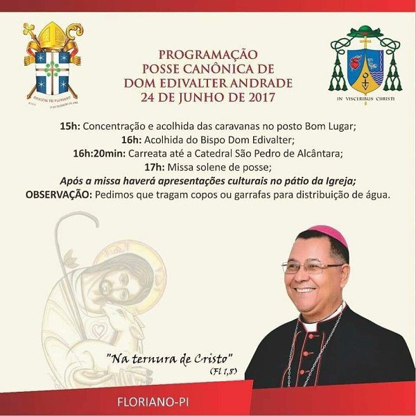 A Diocese de Floriano, localizada à 255 km da capital do Piauí, se prepara para sediar, no próximo sábado (24) a posse canônica de seu terceiro Bispo, Dom Edivalter Andrade. A concentração e acolhida do povo de Deus está marcada para as 15h, no Posto Bom Lugar.