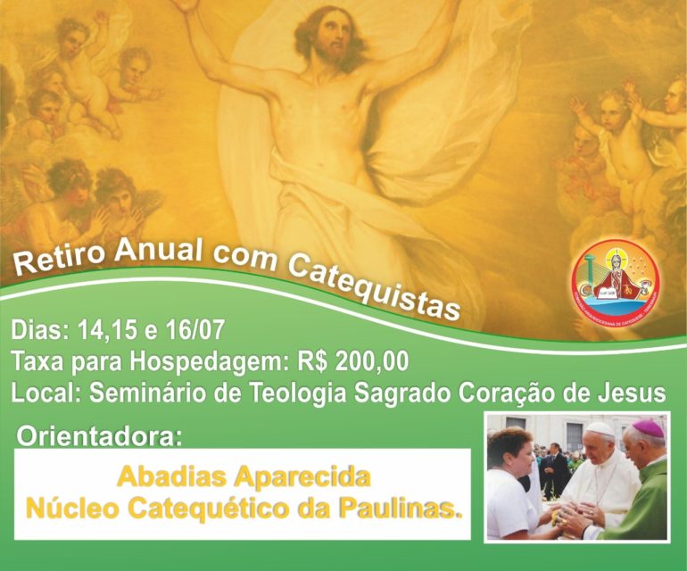 Do dia 14 ao dia 16 de julho, no Seminário Sagrado Coração de Jesus, acontece o Retiro Anual da Catequese. Com a temática ‘Catequese da iniciação à vida cristã e itinerário para formar discípulos missionários’, o momento tem como público alvo apenas aqueles que atuam como catequistas.