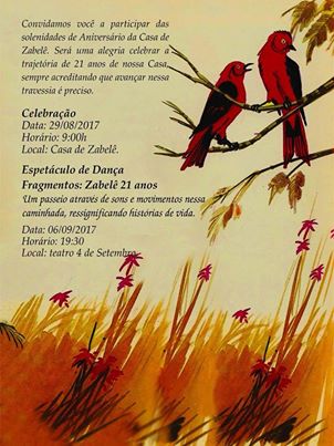 A programação de Aniversário vai ter ainda apresentação do espetáculo de dança “Fragmentos: Zabelê 21 anos”. O espetáculo prevê um passeio através de sons e movimentos nessa caminhada, ressignificando histórias de vida, conforme mensagem apresentada no cartaz de divulgação. A apresentação artística será no dia 06 de setembro, a partir das 19:30h no Teatro 04 de setembro.