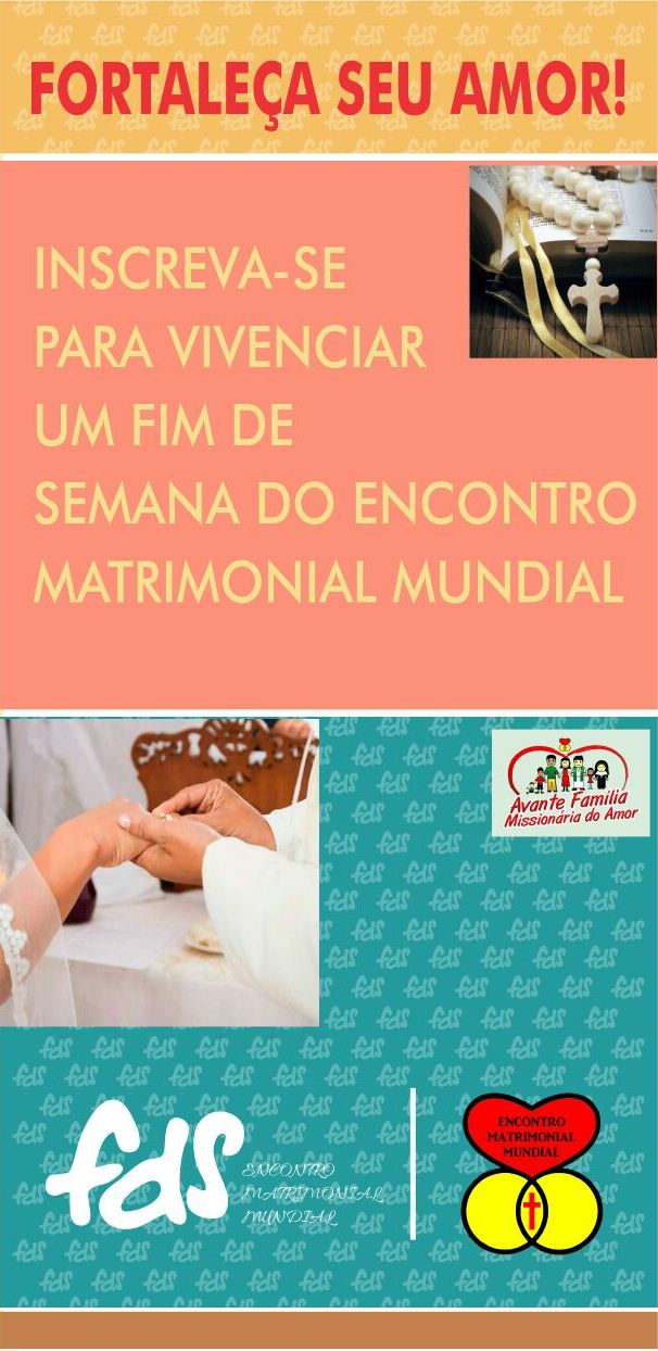 O Encontro Matrimonial Mundial realiza quatro vezes ao ano o “Fim de Semana do EMM”. A próxima edição do evento será nos dias 15,16 e 17 de setembro e o convite é para casais que tenham uma união estável e que não possuam impedimento para receber o sacramento do matrimônio, além de sacerdotes e religiosos.