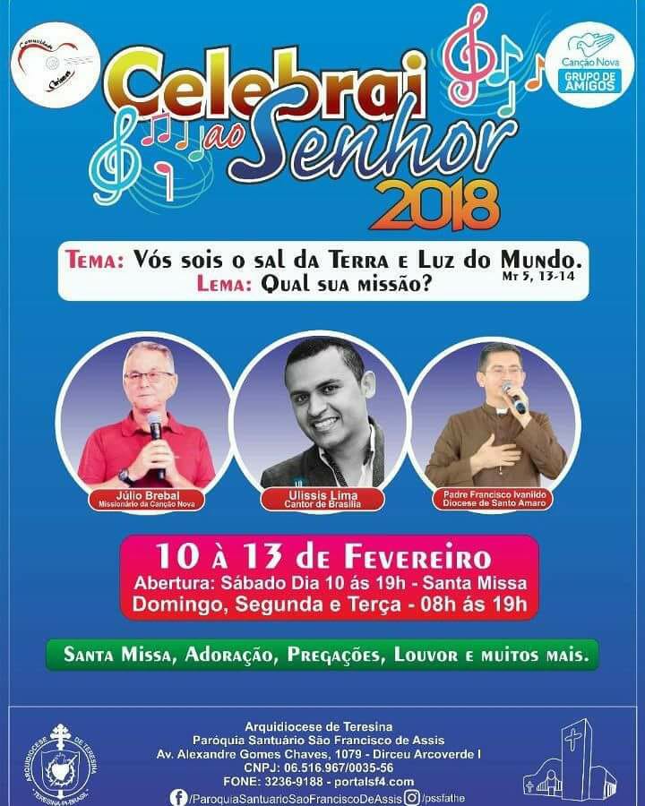 A Paróquia Santuário São Francisco de Assis (Forania Sudeste) vai ofertar uma programação especial para os dias de carnaval. O ‘Celebrai ao Senhor 2018’ é um momento voltado para toda a família que opta por momentos de oração durante os dias de folia. Serão quatro dias de programação onde a temática a ser trabalhada será em sintonia com o Ano do Laicato: ‘Vós sois sal da terra e luz do mundo’ (Mt 5, 13-14).
