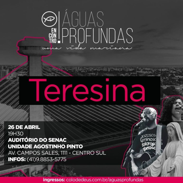 “Uma experiência de profundidade no coração e na vontade de Deus”, assim definem os organizadores do momento intitulado: Encontro Águas profundas. O evento será realizado dia 26 de abril, a partir das 19h, no Auditório do Senac, que fica localizado na Avenida Campos Sales, centro da capital. O convite também é um aprofundamento na vida e obra de Maria e tem a responsabilidade da Comunidade Católica Colo de Deus.