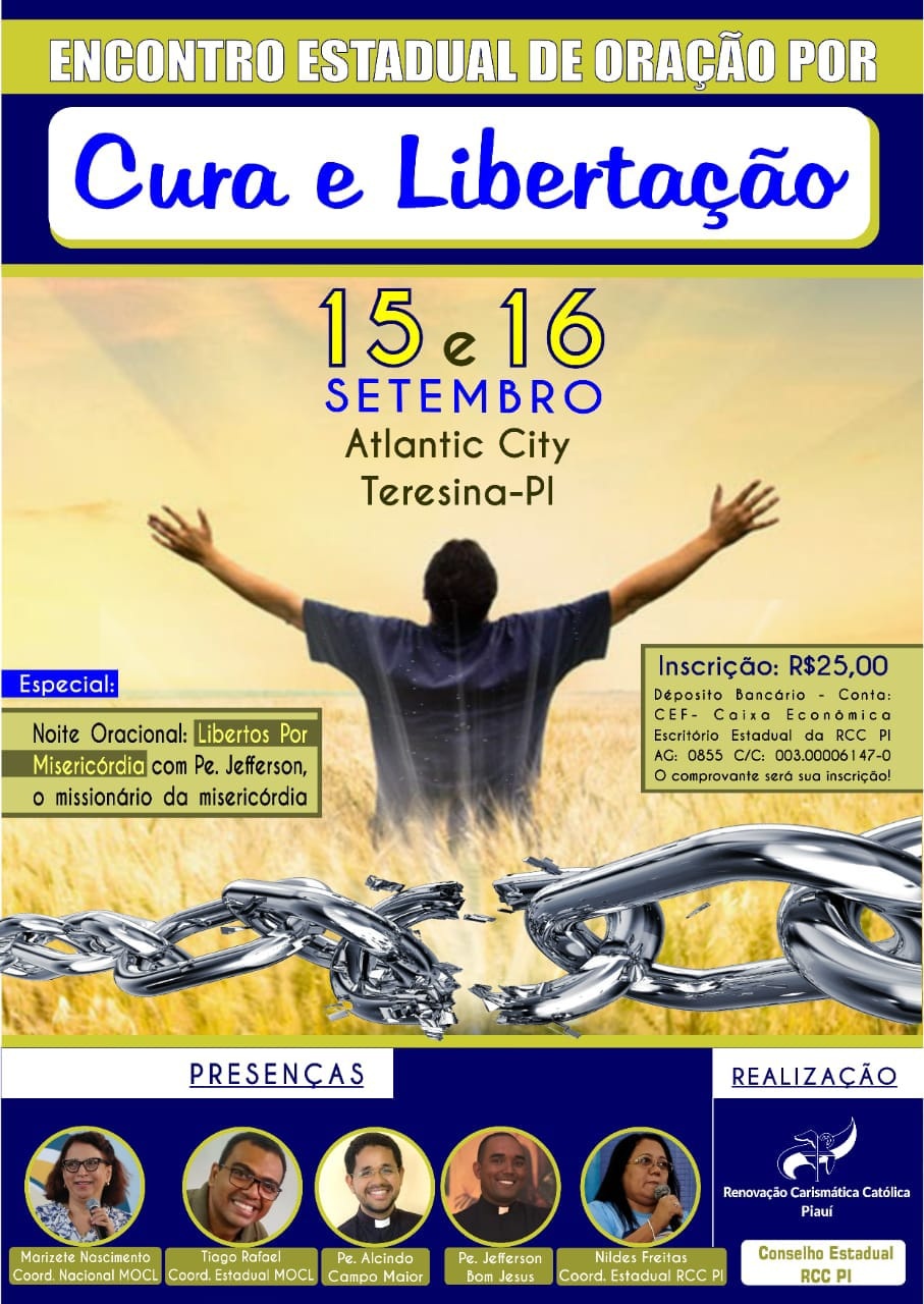 O Conselho Estadual da Renovação Carismática Católica no Piauí – RCC realiza nos dias 15 e 16 de setembro o Encontro Estadual de Oração por Cura e Libertação. O evento acontecerá no Atlantic City em Teresina e é aberto a toda a comunidade. O início da programação está previsto para 7:30 da manhã com o Santo Terço.