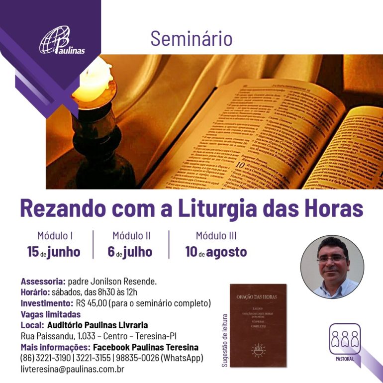 Visando em expandir conhecimentos a respeito da liturgia das horas, a livraria Paulinas em Teresina promoverá o seminário “Rezando com a liturgia das horas”, com o formador do Seminário de Teologia Sagrado Coração de Jesus, padre Jonilson Resende. Separado por módulos, o curso acontecerá aos sábados, nos dias 15 de junho, 6 de julho e 10 de agosto, das 8h:30 às 12h da manhã, no auditório da livraria.