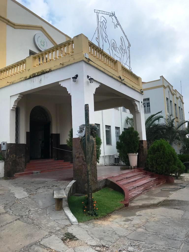 O totem duplo está fixado na entrada principal da Cúria. O monumento é feito em cimento e foi produzido manualmente por um artesão do Ceará.
