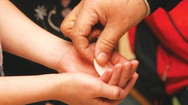 “Quando te aproximares, não caminhes com as mãos estendidas ou os dedos separados, mas faze com a esquerda um trono para a direita, que está para receber o Rei; e logo, com a palma da mão, forma um recipiente; recolhe o corpo do Senhor, e dize: “Amém”. A seguir, santifica com todo o cuidado teus olhos pelo contato do Corpo Sagrado, e toma-o. Contudo cuida de que nada caia por terra, pois, o que caísse, tu o perderias como se fossem teus próprios membros. Responde-me: se alguém te houvesse dado ouro em pó, não o guardarias com todo o esmero e não tomarias cuidado para que não te caísse das mãos e para que nada se perdesse? Sendo assim, não deves com muito esmero cuidar de que não caia nem uma migalha daquilo que é mais preciso do que o ouro e as pedras preciosas?” (São Cirilo de Jerusalém, sobre a eucaristia, Catequese Mistagógica V 21 s).