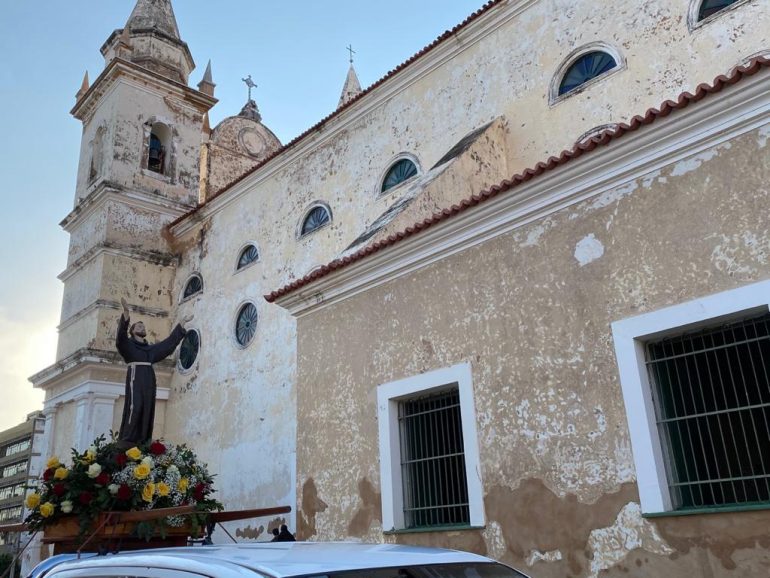 “Você que veio para o interior da igreja São Benedito, e também quem está acompanhando de casa, queria dizer o quanto estamos felizes por esse momento. Nos esforçamos muito para que pudéssemos acolher dentro da nossa casa, que é essa igreja”, comenta Frei Chagas, durante recepção aos fiéis.