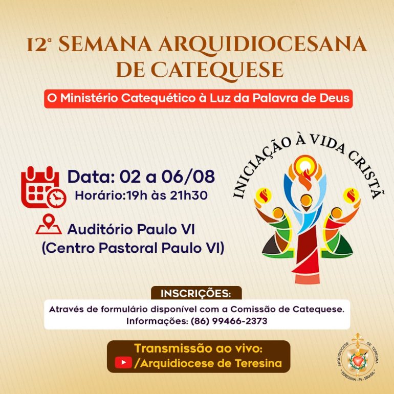 Nos dias 02 a 06 de agosto, a Comissão Arquidiocesana de Catequese realiza a 12° Semana Arquidiocesana de Catequese. As inscrições vão ser feitas por meio do preenchimento de um formulário online e deverão ser realizadas até o dia 20 de julho.