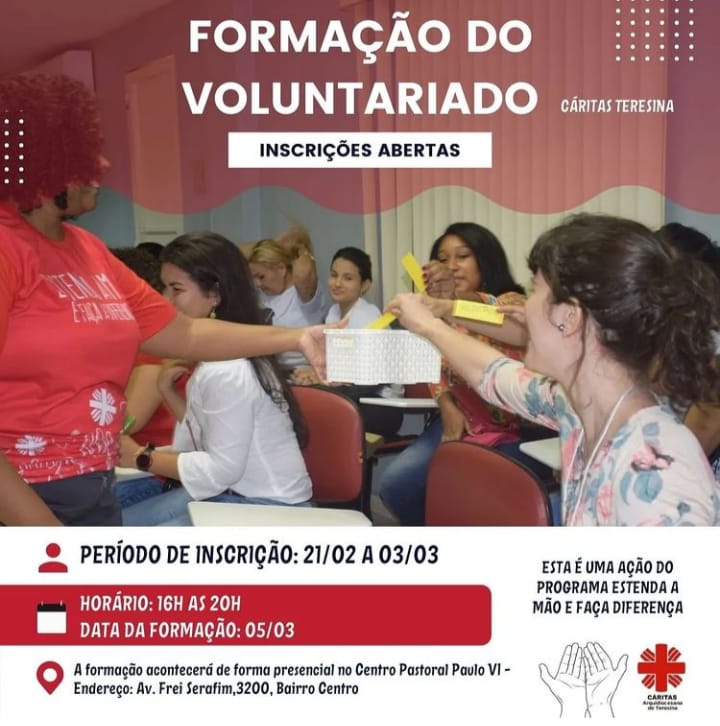 As inscrições para participar da Formação de Voluntários da Cáritas Arquidiocesana iniciaram nesta segunda-feira (21). O curso será ministrado no dia 05 de março, das 16h às 20h, no Centro Pastoral Paulo VI, e tem como objetivo motivar o serviço de caridade promovido por meio das diversas ações da instituição.