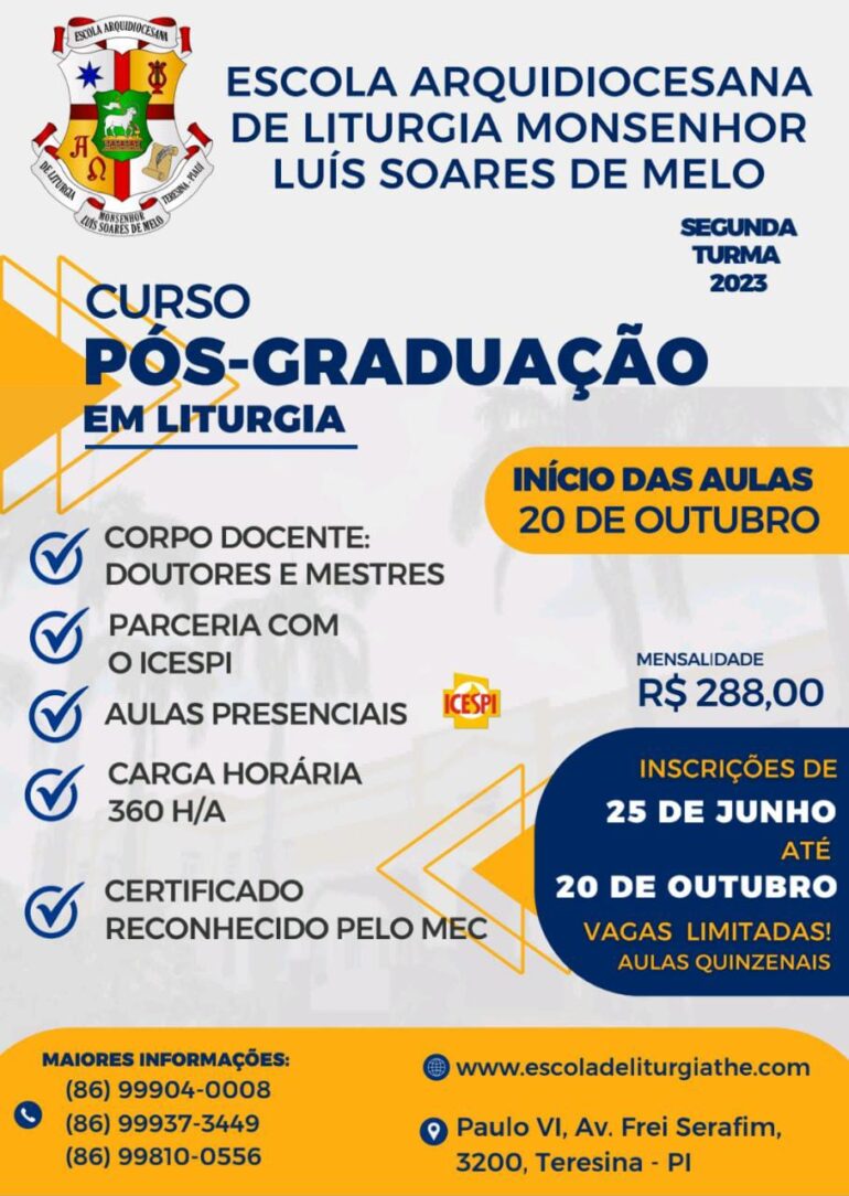 A Escola Arquidiocesana de Liturgia Monsenhor Luís Soares de Melo está com inscrições abertas para a segunda turma do curso de Pós-graduação em Liturgia e extensão acadêmica, oferecido em parceira com o Instituto Católico de Estudos Superiores do Piauí (ICESPI).