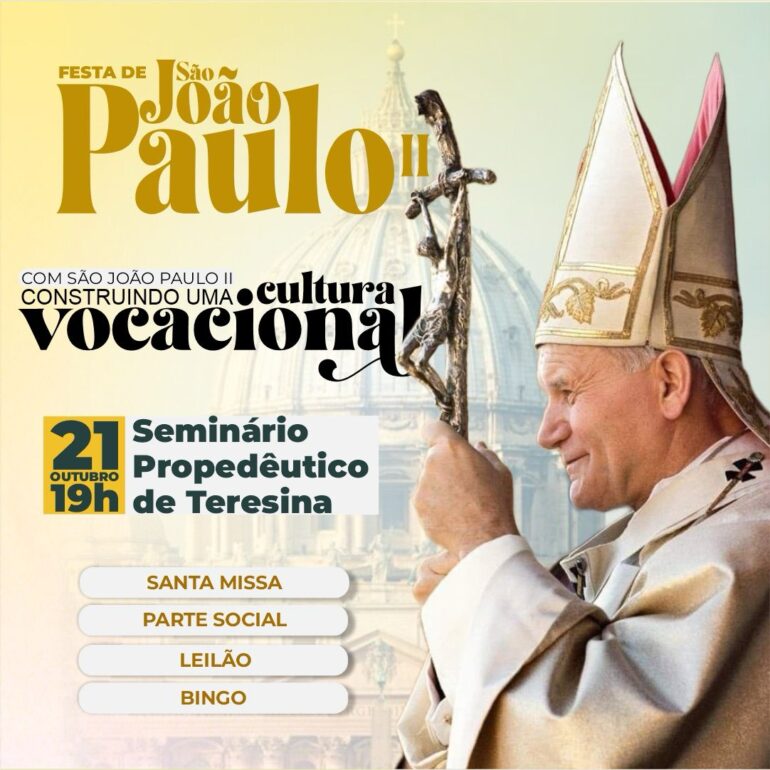 O Seminário Propedêutico de Teresina realizará neste sábado, dia 21 de outubro, a Festa de São João Paulo II, padroeiro desta casa de formação. Com o tema ‘Com São João Paulo II construindo uma cultura vocacional’, a celebração terá início às 19h no próprio Seminário, situado na Rodovia Palmeiras, bairro Angelim. Após a Santa Missa os fiéis são convidados a participar do momento social.