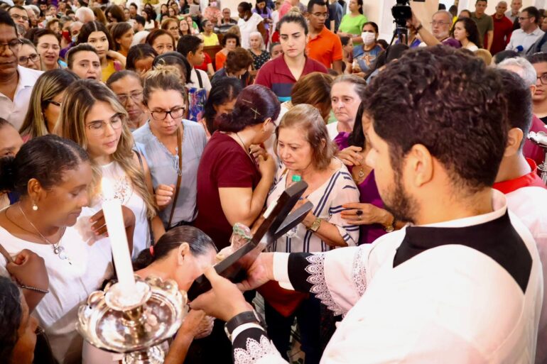 Os fiéis presentes na Catedral de Teresina fizeram um gesto de adoração ao Cristo Crucificado, momento de grande emoção e gratidão pela entrega realizada pelo Senhor no alto do Calvário.