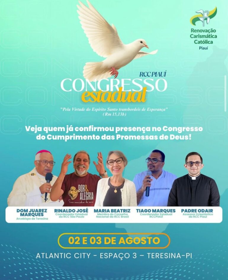 Entre os dias 2 e 3 de agosto, a Renovação Carismática Católica (RCC) do Piauí, vai realizar o Congresso Estadual Jubilar em comemoração aos 45 anos de evangelização carismática no estado. Com o tema “RCC Piauí: 45 anos de missão e unção no Espírito Santo”, o momento vai acontecer no Centro de Convenções Atlantic City e deve reunir fiéis de todas as dioceses piauienses para três dias de profunda espiritualidade, formação e celebração.