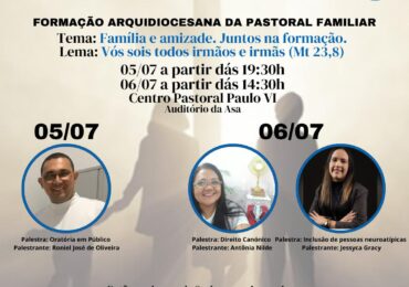 A Arquidiocese de Teresina, por meio da Comissão da Pastoral Familiar, realizará uma Formação Arquidiocesana nos dias 05 e 06 de julho. Com o tema “Família e Amizade: Juntos na Formação” e o lema “…