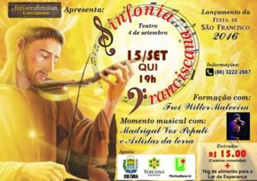 Dia 15 de setembro os freis capuchinhos do convento de São Benedito realizarão a Sinfonia Franciscana. O evento é aberto ao público e terá início às 19h, no Teatro 4 de setembro, no centro de Teres…