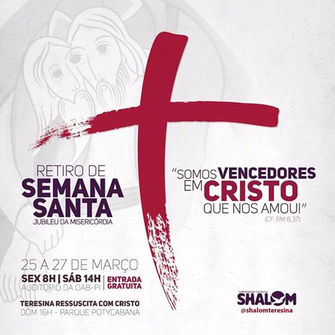 Com o objetivo de reviver a maior prova de amor de todos os tempos, e de mergulhar no caminho de cruz, ressurreição e salvação em Jesus Cristo, a Comunidade Católica Shalom Teresina promove nos dia…