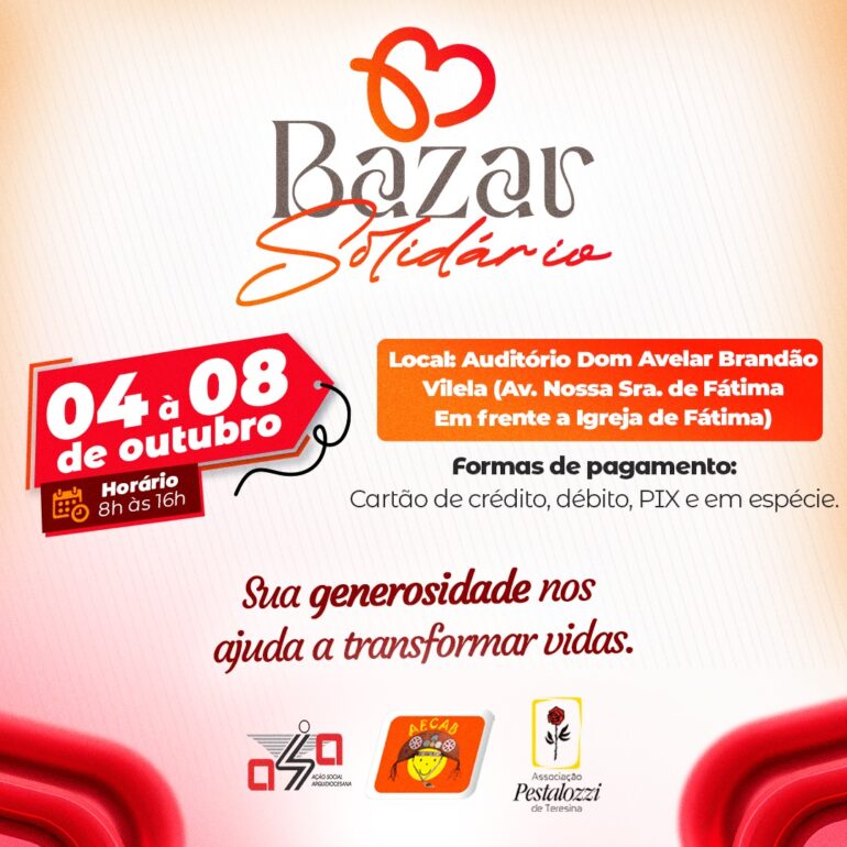Entre os dias 04 e 08 de outubro, a Ação Social Arquidiocesana (ASA), em parceria com a Associação Pestalozzi de Teresina e a Associação Educativa e Cultura Asa Branca de Juazeiro do Norte (CE), realizará o Bazar Solidário com as mercadorias doadas pela Receita Federal. O Bazar vai acontecer das 08h às 16h no auditório Dom Avelar Brandão Vilela, em frente à Igreja de Fátima, localizada na Av. Nossa Senhora de Fátima, zona Leste de Teresina.