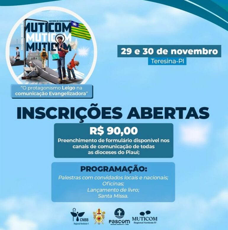 Nos dias 29 e 30 de novembro, a Arquidiocese de Teresina sediará a 3ª edição do Mutirão de Comunicação do Regional Nordeste IV (Muticom Regional). O evento será realizado no Auditório Dom Avelar Brandão Vilela, localizado na Av. Nossa Senhora de Fátima, e terá como objetivo dialogar sobre o papel do leigo na comunicação evangelizadora, promovendo e disseminando os valores do Evangelho nas diversas plataformas de comunicação social.