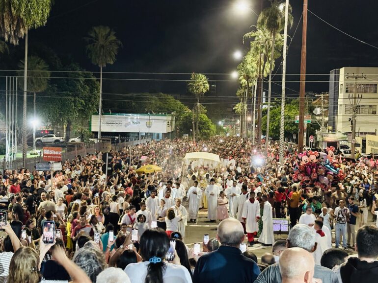 Na tarde da última quinta-feira (19), uma verdadeira multidão tomou conta das ruas do Centro da cidade para celebrar a tradicional Festa de Corpus Christi. A solenidade teve início às 16h com a Santa Missa, presidida pelo arcebispo metropolitano Dom Juarez Marques e concelebrada por padres e diáconos da Arquidiocese de Teresina. A celebração foi realizada na Catedral Metropolitana de Nossa Senhora das Dores e contou com a participação ativa do clero, de ministros e de milhares de fiéis.