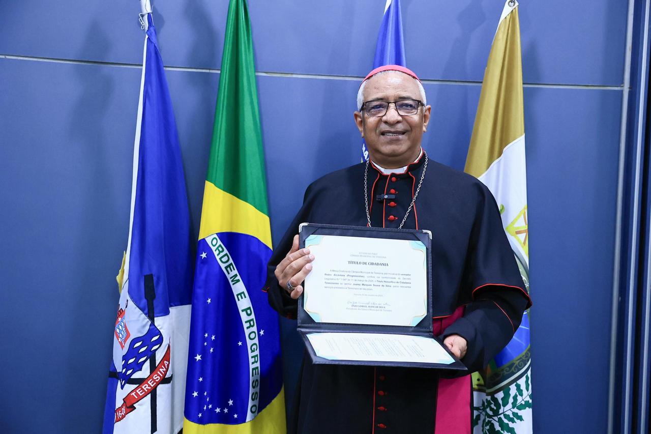A Câmara Municipal de Teresina realizou, nesta sexta-feira (03), a entrega do Título Honorífico de Cidadania Teresinense ao arcebispo metropolitano de Teresina, Dom Juarez Marques Sousa da Silva. A honraria, de autoria do vereador Pedro Alcântara, reconhece os relevantes serviços prestados por Dom Juarez à capital piauiense, especialmente no âmbito religioso e social.