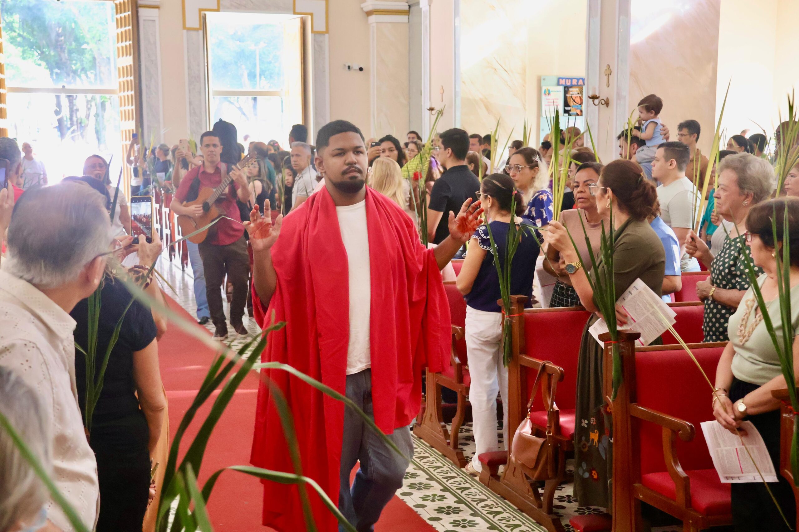 Ao chegarem à Catedral, os fiéis entraram na igreja balançando os ramos e entoando cânticos, simbolizando a entrada de Cristo na cidade santa. Em seguida, uma encenação inspirada na Campanha da Fraternidade deste ano chamou a atenção dos participantes. O jovem Wellington Lopes, integrante do Encontro de Jovens com Cristo (EJC) da Catedral, representou uma pessoa em situação de rua, promovendo uma reflexão sobre a realidade de pessoas em vulnerabilidade.